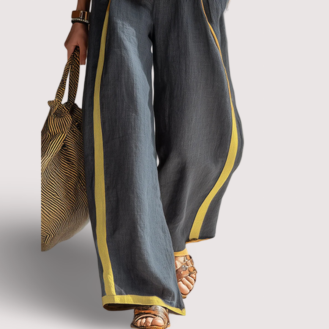 Bezramenný top a široké kalhoty jsou střiženy tak, aby lichotily každému typu postavy a vykouzlily ležérně-elegantní siluetu. Charakteristický kontrastní lem dodává subtilní akcent – minimalistický v designu, ale rozhodně ne obyčejný.