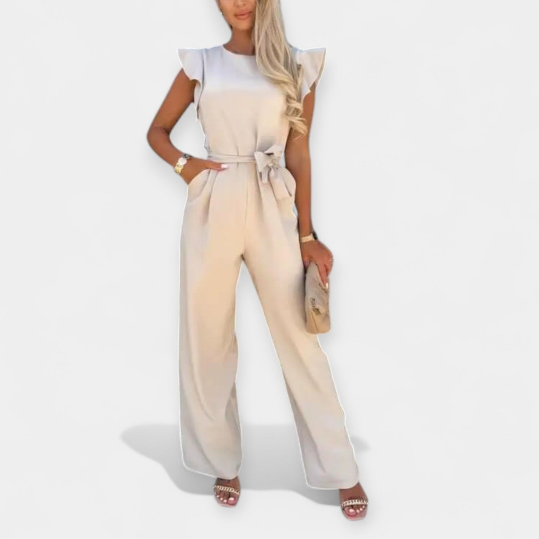 Tento overal kombinuje eleganci a pohodlí a zaujme detaily, jako jsou motýlí rukávy a pásek, který zvýrazňuje pas. Ideální pro formální i casual příležitosti, je to nezbytná volba.
